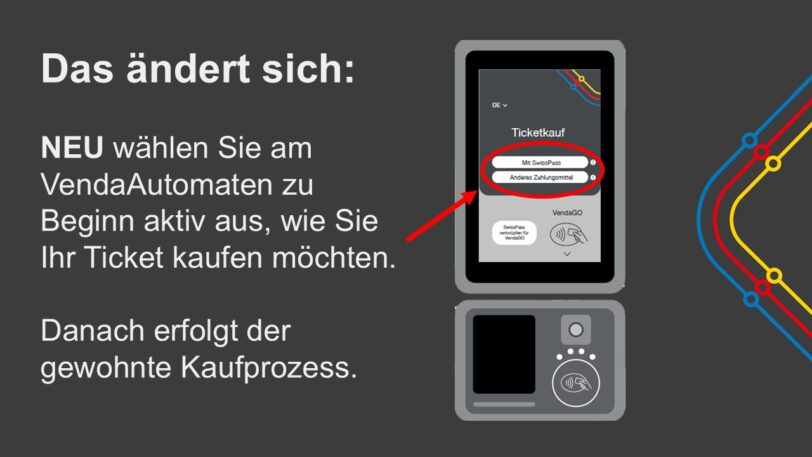 Aufgepasst – mit der Systemerweiterung ändert sich bei allen VendaAutomaten der Verkaufsprozess leicht. Sie wählen zu Beginn aktiv aus, ob Sie Ihr Ticket mit SwissPass oder mit einem anderen Zahlungsmittel kaufen: